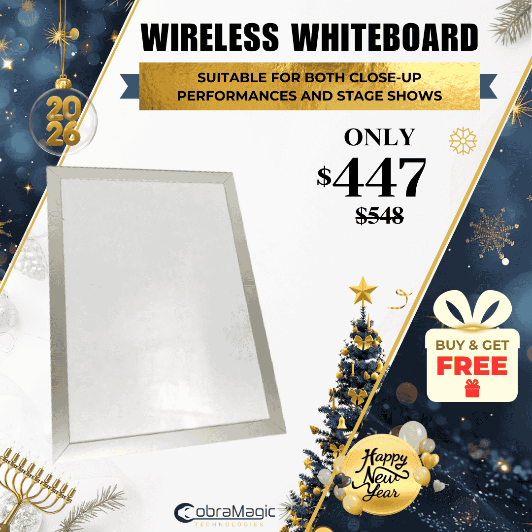 A perfectly innocent looking whiteboard. There is absolutely no visual clue that it communicates with a miniature receiver that sends you an indication the moment that a written item is erased. The volunteer writes up to 5 names, or countries, favorite restaurant, dishes etc. on the board. You can stand up to 50 meters away and even be blindfolded – yet you miraculously “know” each item as it's erased. The board has 2 sides, so you can work simultaneously on both sides, handling 10 different items at the same time, or even create correlations between the items written on both sides.